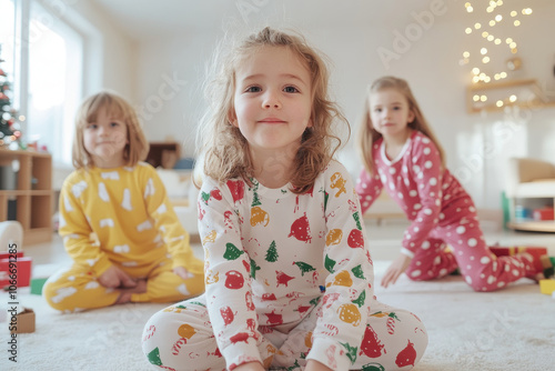 Joyful children in colorful pajamas celebrating Christmas at home