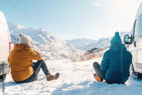 Friends enjoying a snowy Christmas day by the camper van