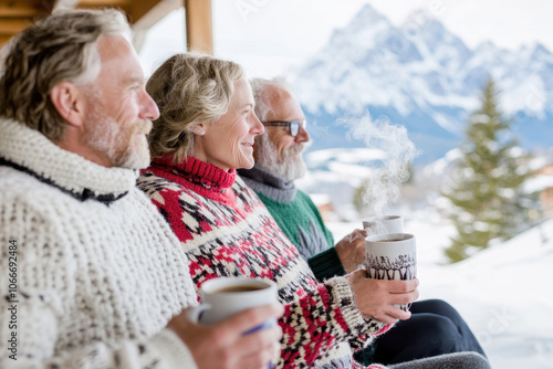 Friends enjoying a cozy christmas gathering in the snowy mountains