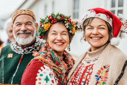 Group of diverse people in festive sweaters celebrating Christmas outdoors