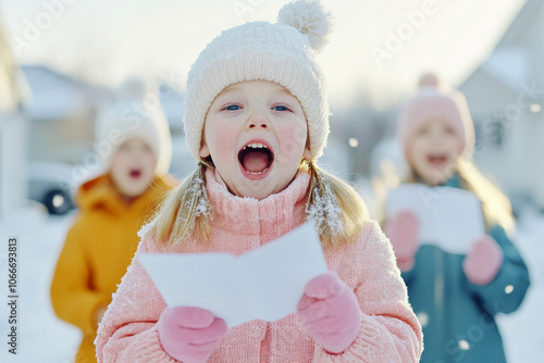 Children joyfully singing Christmas carols in a snowy neighborhood