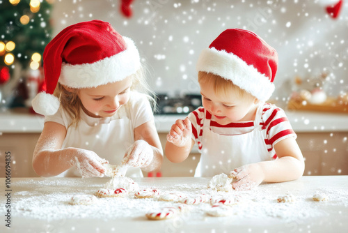 Children joyfully building a snowman during a magical snowfall in winter wonderland with bright colors and festive spirit.