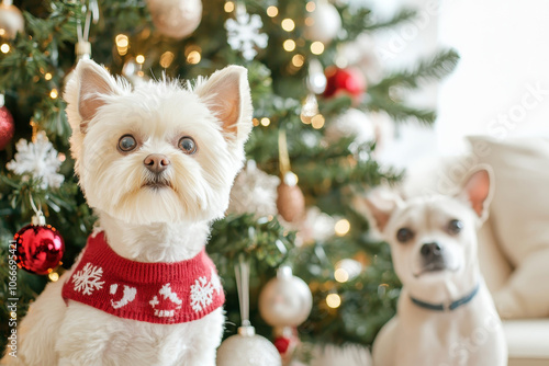 Adorable dogs in festive sweaters by a decorated Christmas tree