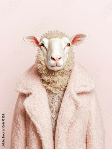 Chic sheep in haute couture showcases stylish elegance with a touch of humor in a pastel setting