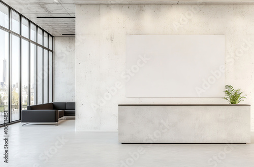 Minimalist conference room interior with large blank projection screen and panoramic windows