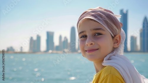 Joyful Qatari non-binary child enjoying nature with a cityscape backdrop