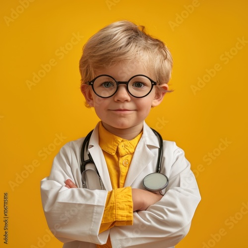 Adorable child dressed as a biologist wearing a white lab coat and safety goggles with a bright yellow background