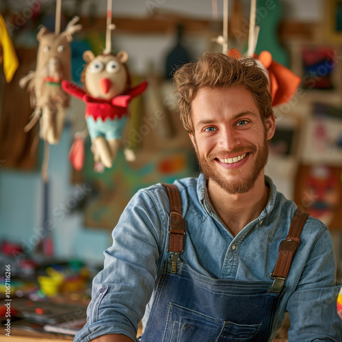 Skilled puppeteer in workshop surrounded by handcrafted puppets