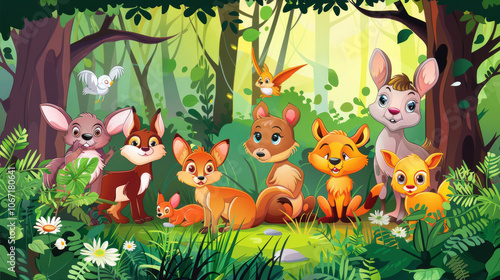 Friendly cartoon animals in a vibrant forest glade, full of life and color