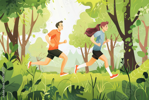 Man and woman enjoying a healthy lifestyle by jogging in a lush woodland setting