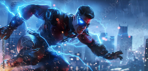 Anime-inspired superhero in dynamic pose against a city skyline at night