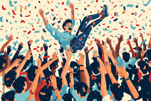 Illustration of man being joyfully thrown in the air by a celebrating crowd with confetti