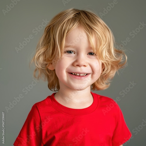 Joyful portrait of a blonde German preschooler in a red shirt, giggling with happiness on a plain background