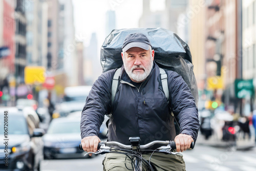 Mature delivery driver cycling through bustling urban streets