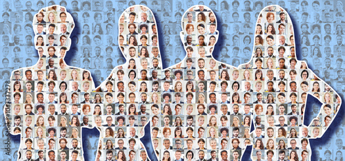 Silhouetten von Geschäftsleuten vor Collage aus vielen Mitarbeiter Portraits
