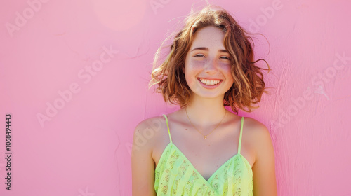 Portrait of a smiling teenage girl with pink hair and freckles on a green background