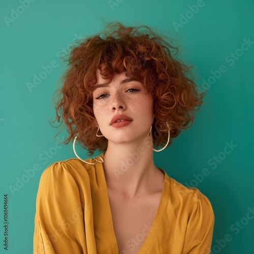 Portrait of a confident woman with curly russet hair in a yellow blouse against a teal background, exuding energy and a bold, fashionable style