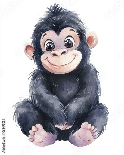 Adorable watercolor gorilla cartoon illustration with a happy expression perfect for nursery decor