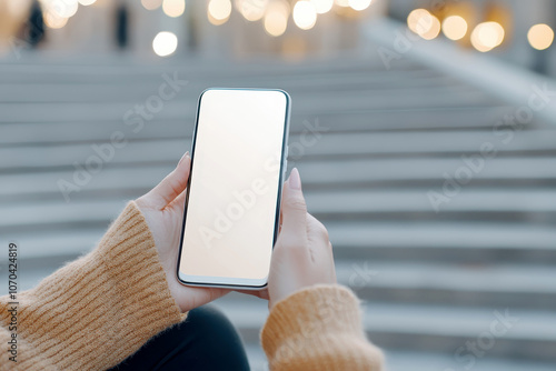 Female hand holding smartphone with blank screen as mockup