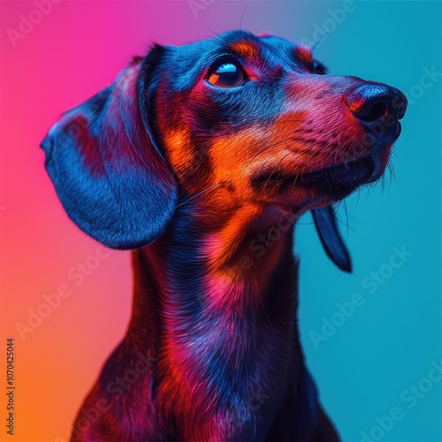 Colorful studio portrait of a Dachshund dog with vibrant lighting in medium format photography highlighting a creative and expressive canine expression