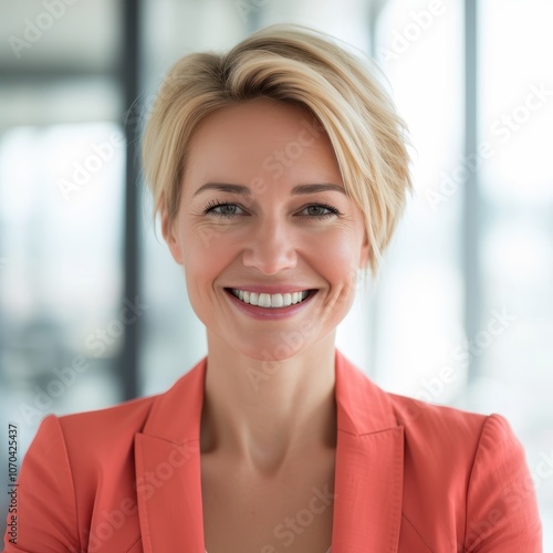 Confident French businesswoman in red blazer posing in office environment