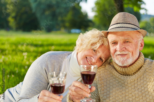 Glückliches Paar Senioren trinkt Rotwein im Garten