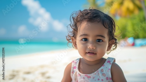 Portrait of a cheerful Micronesian child enjoying nature on a sunny beach