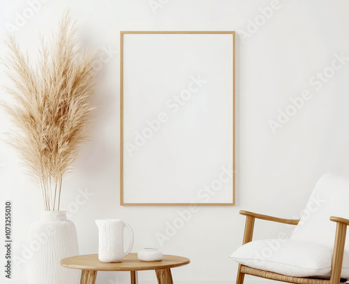 Minimalist living room interior with empty frame, wooden chair and decorative vase