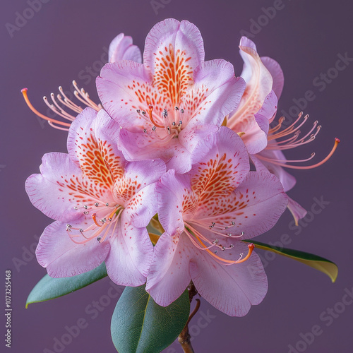 Studio shot of a vibrant pink rhododendron flower with detailed petals and a soft purple background for an artistic and elegant botanical display