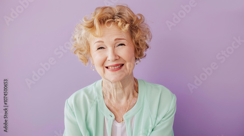Radiant senior woman with a joyful smile and stylish short curls posing against a purple background