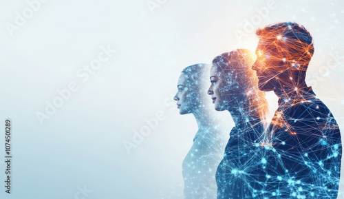Abstract visualization of artificial intelligence with human figures and data nodes
