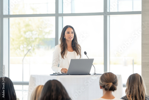 Smiling businesswoman sitting at desk with a laptop in bright office