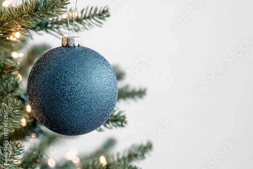Elegant blue Christmas ornament hanging on a decorated tree