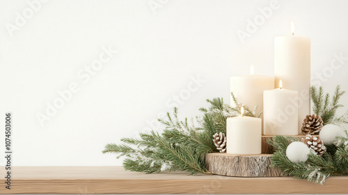 Cozy holiday decor with candle, pinecone and evergreen branch