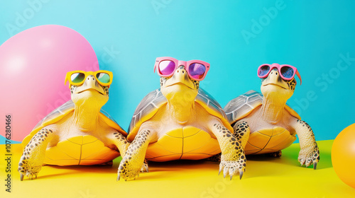 Three cool turtles wearing sunglasses in vibrant colorful setting