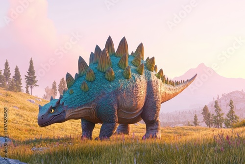Majestic Stegosaurus roaming vibrant prehistoric landscape at sunset