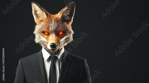 Mischievous fox-headed figure in a tailored suit with glowing eyes
