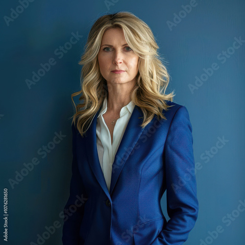 Portrait of a steadfast Northeast European woman in her 50s wearing a blue suit