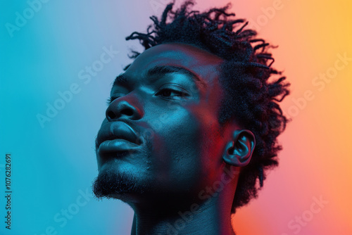 Striking neon light portrait of a young, bold African American with a focus on skin care and confidence