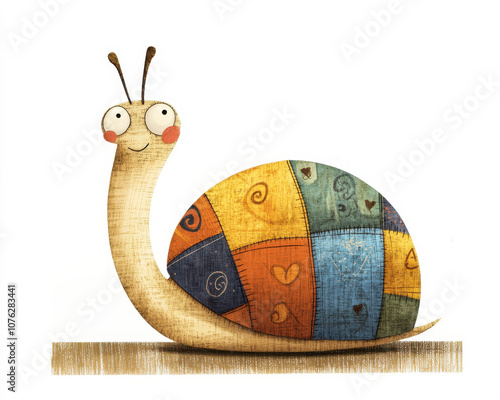 Charming folk art snail illustration with colorful patchwork shell in a whimsical storybook style