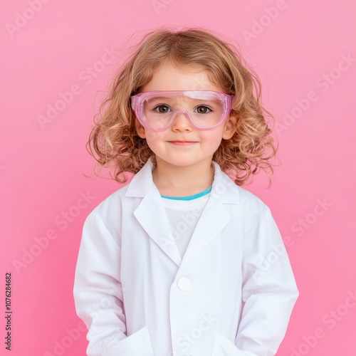 Adorable child dressed as a scientist with lab coat and goggles standing against a pink background