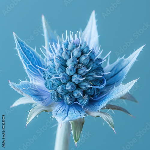 Stunning professional studio shot of a Sea Holly flower with intricate details and vibrant blue hues, capturing the beauty of Eryngium in a serene setting.