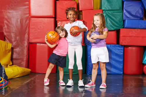 Mädchen stehen mit Bällen in Turnhalle
