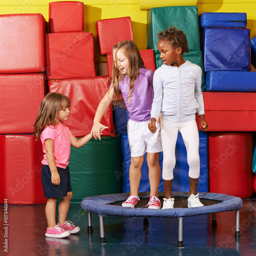Gruppe Kinder in Turnhalle hält Daumen hoch