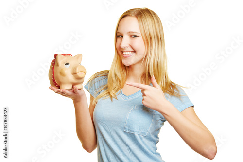Young woman pointing to piggy bank
