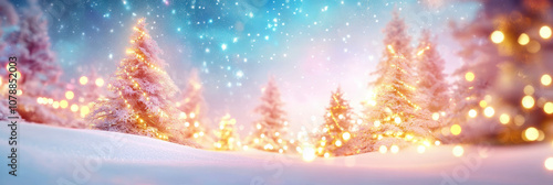 Enchanted winter landscape with illuminated Christmas trees