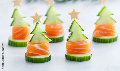 Festive cucumber and salmon appetizers shaped like Christmas trees