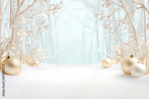 Christmas tree with white ornaments in a snowy winter setting, festive holiday decor