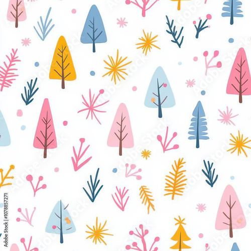 Charming Christmas pattern with whimsical illustrated trees and snowflakes