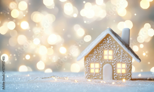 Modern little Christmas tree in glass jar with bokeh lights in background